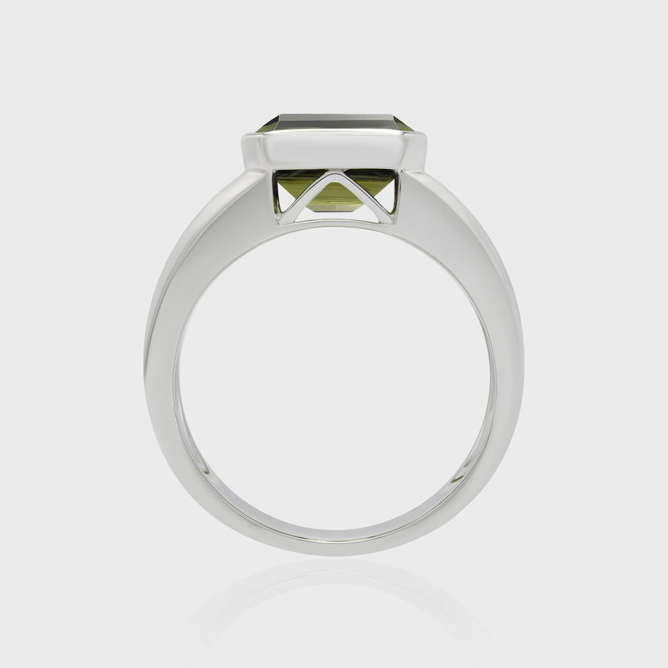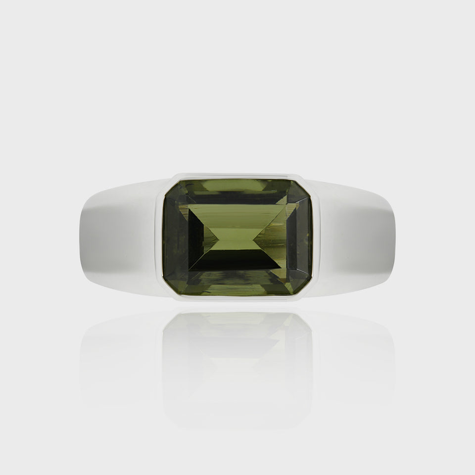 Deep green like a hunter's eye—calm, calculated, always one step ahead. With a bold emerald cut and wide silver band, this ring is for the predator in a suit, striking with precision and commanding respect.